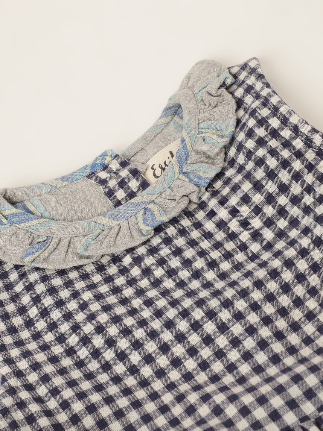 Features a roomy bodice, gathered knee-length skirt and a contrast frill at the bottom.