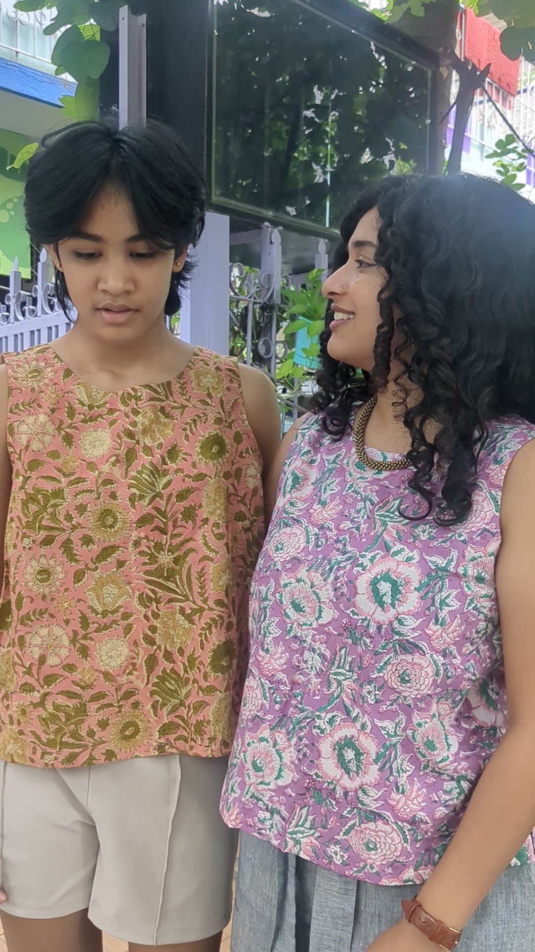 Summer-ready sleeveless top for women in block-printed cotton. Features an A-line seam with a round neck. Pull-over style with no button closures. Ends right at the hip line. Looks great paired with skirts, pants or shorts.