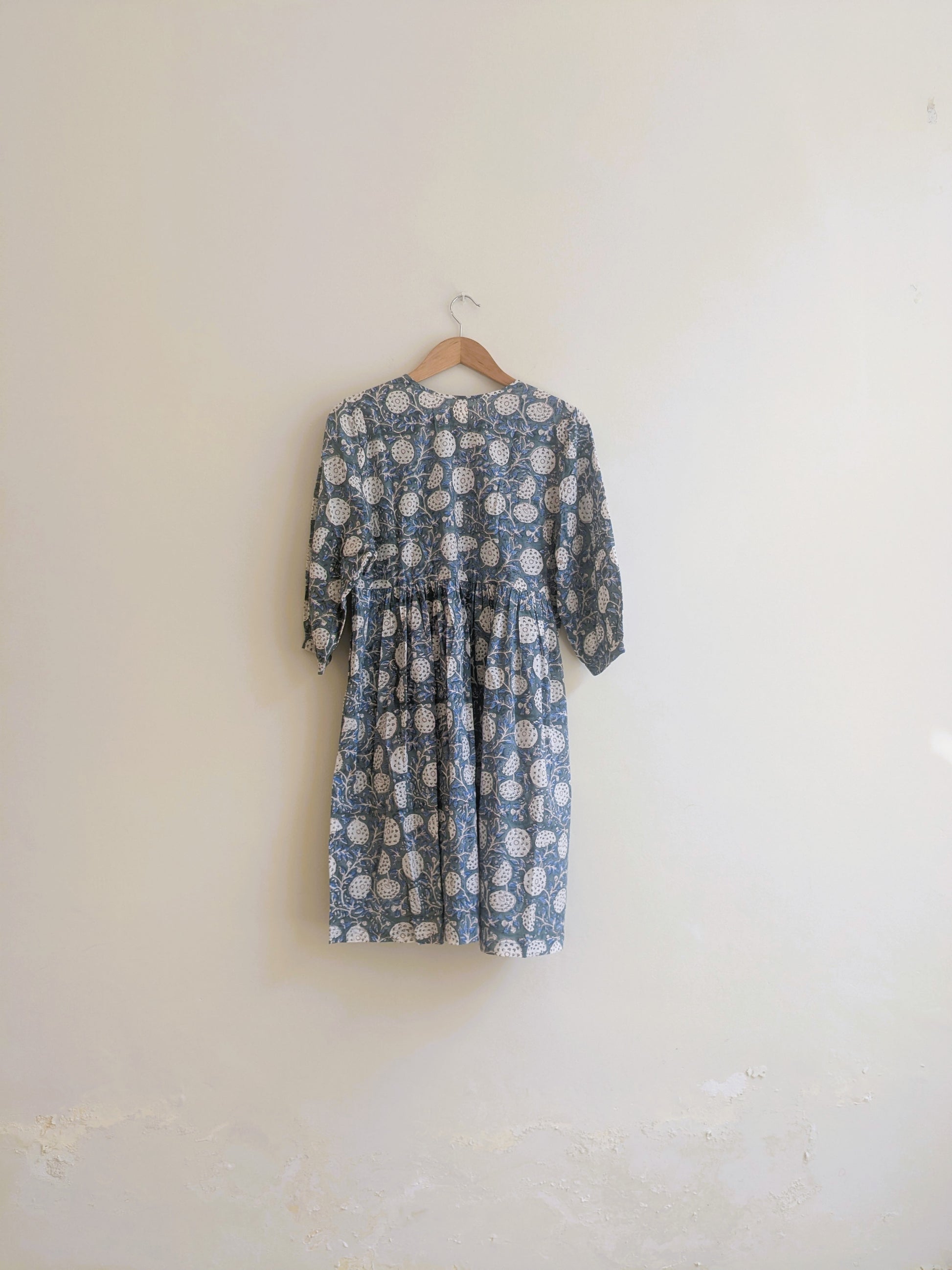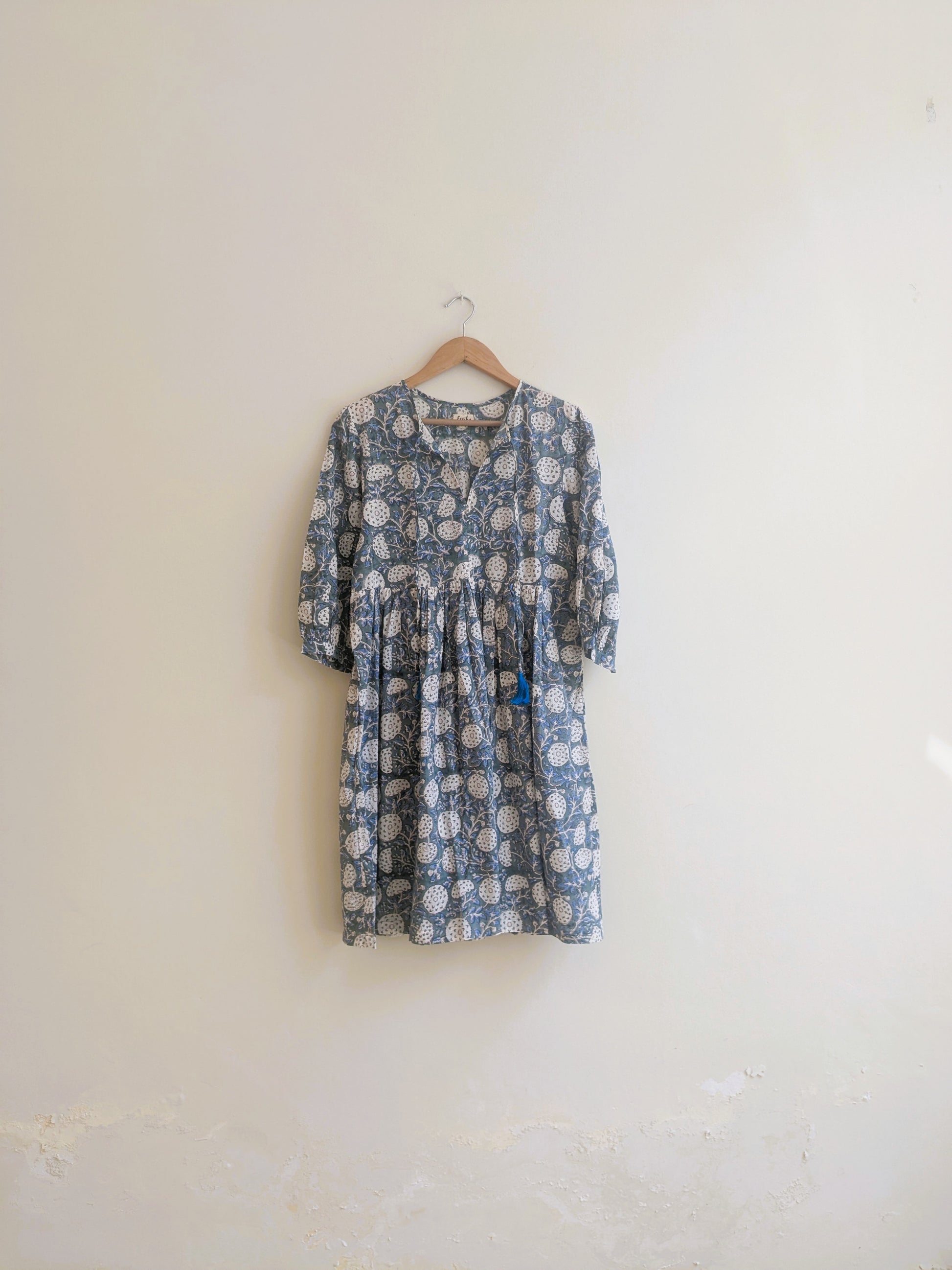 A flattering knee-length dress with extra room around the armholes and a 3/4th length sleeve. Features two side pockets.