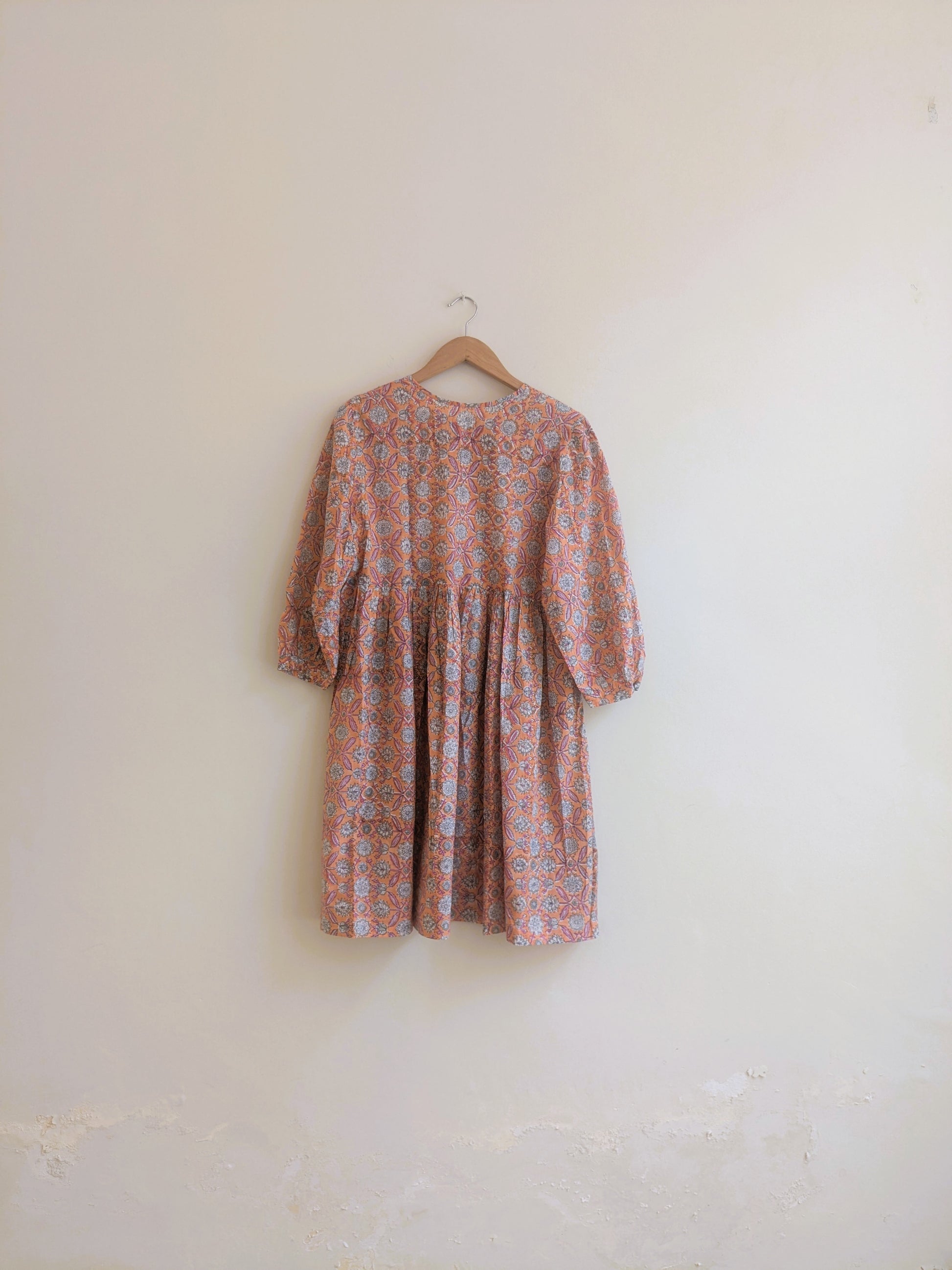 A flattering knee-length dress with extra room around the armholes and a 3/4th length sleeve. Features two side pockets.