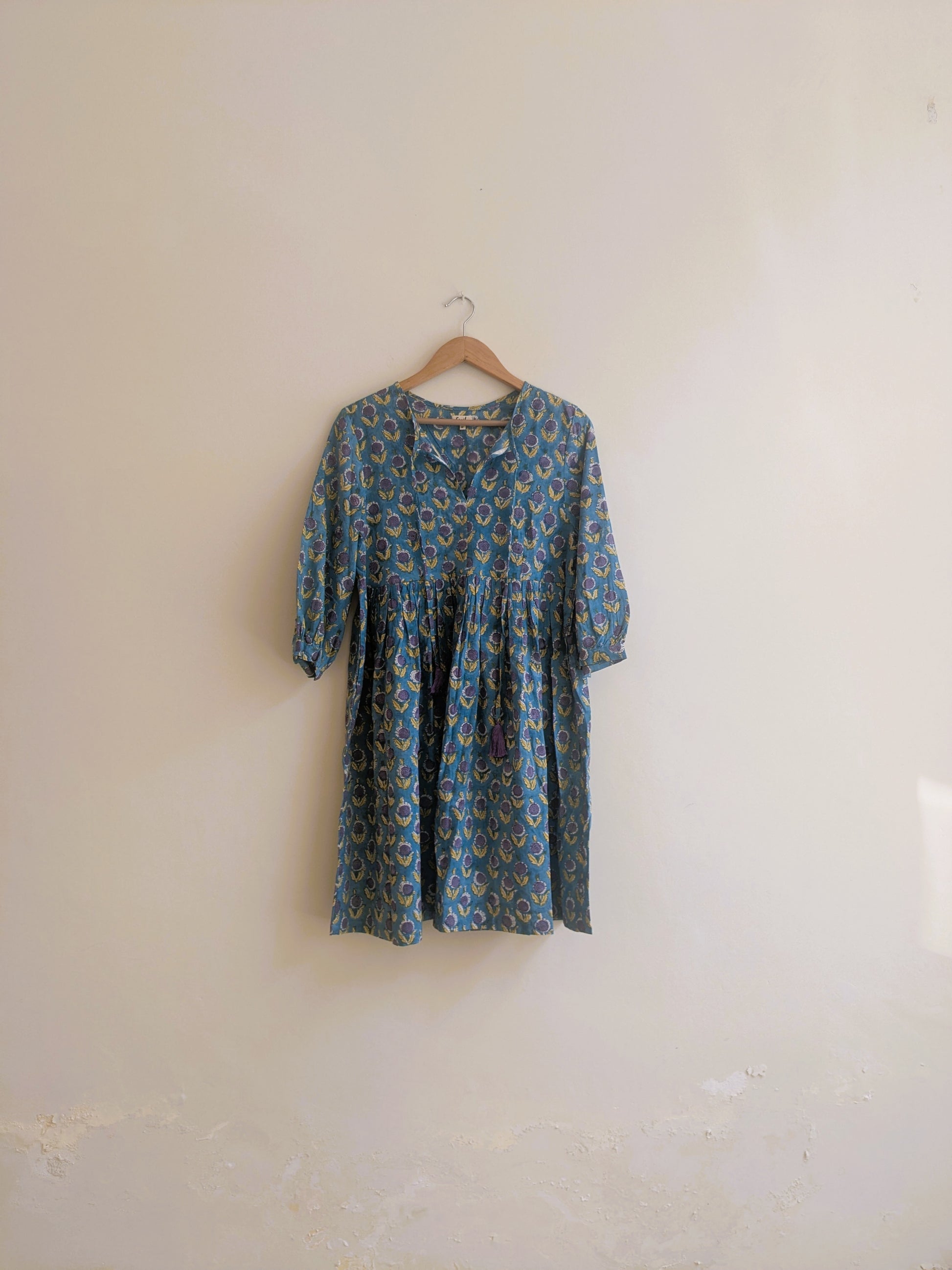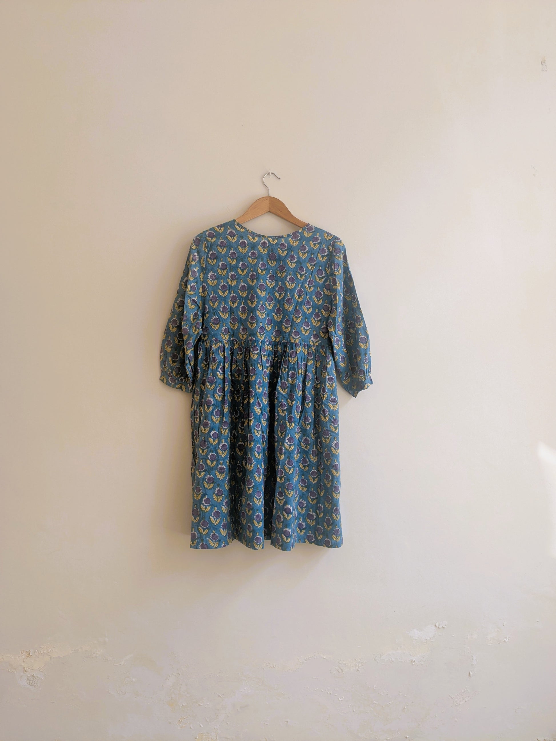 A flattering knee-length dress with extra room around the armholes and a 3/4th length sleeve. Features two side pockets.