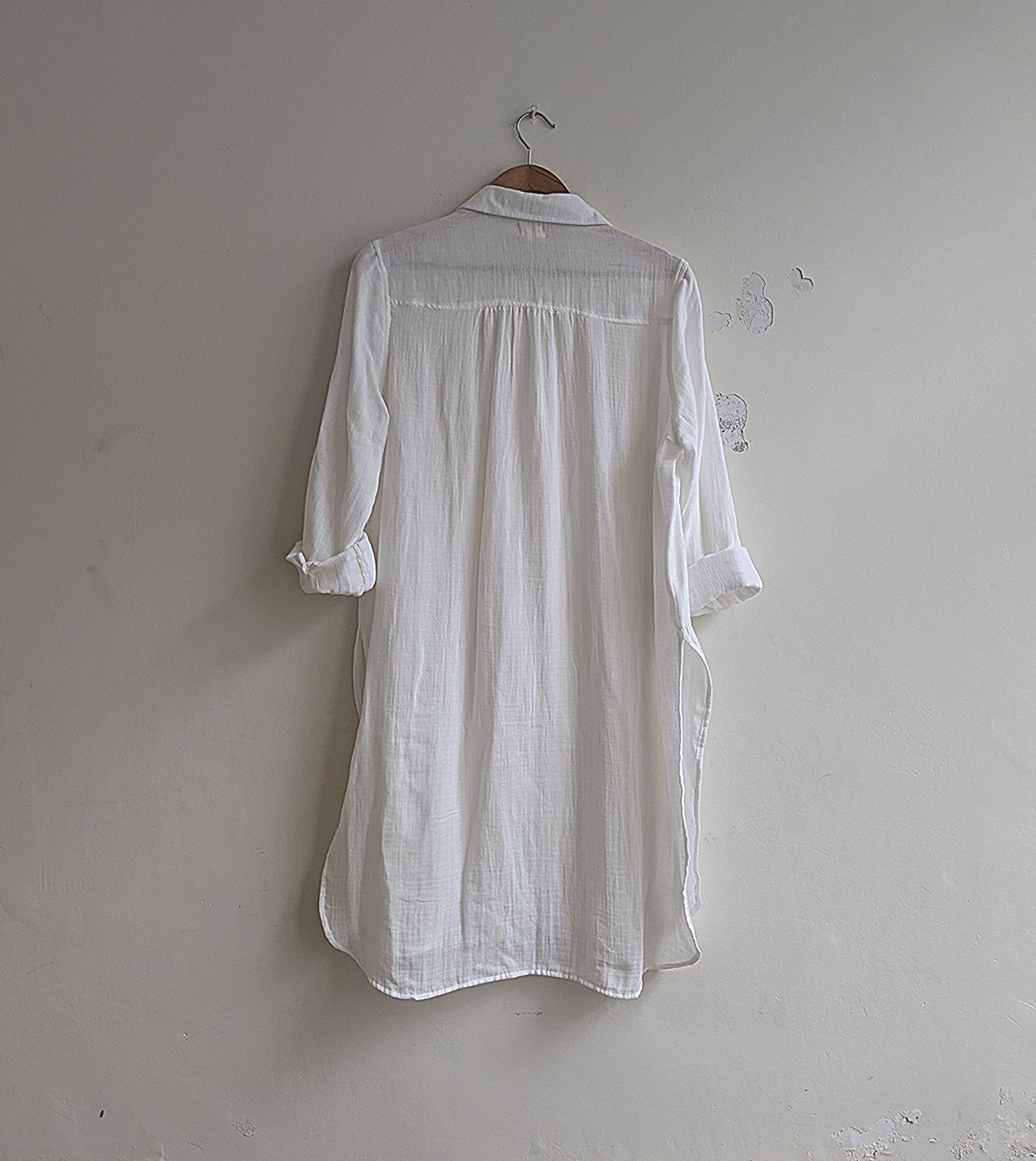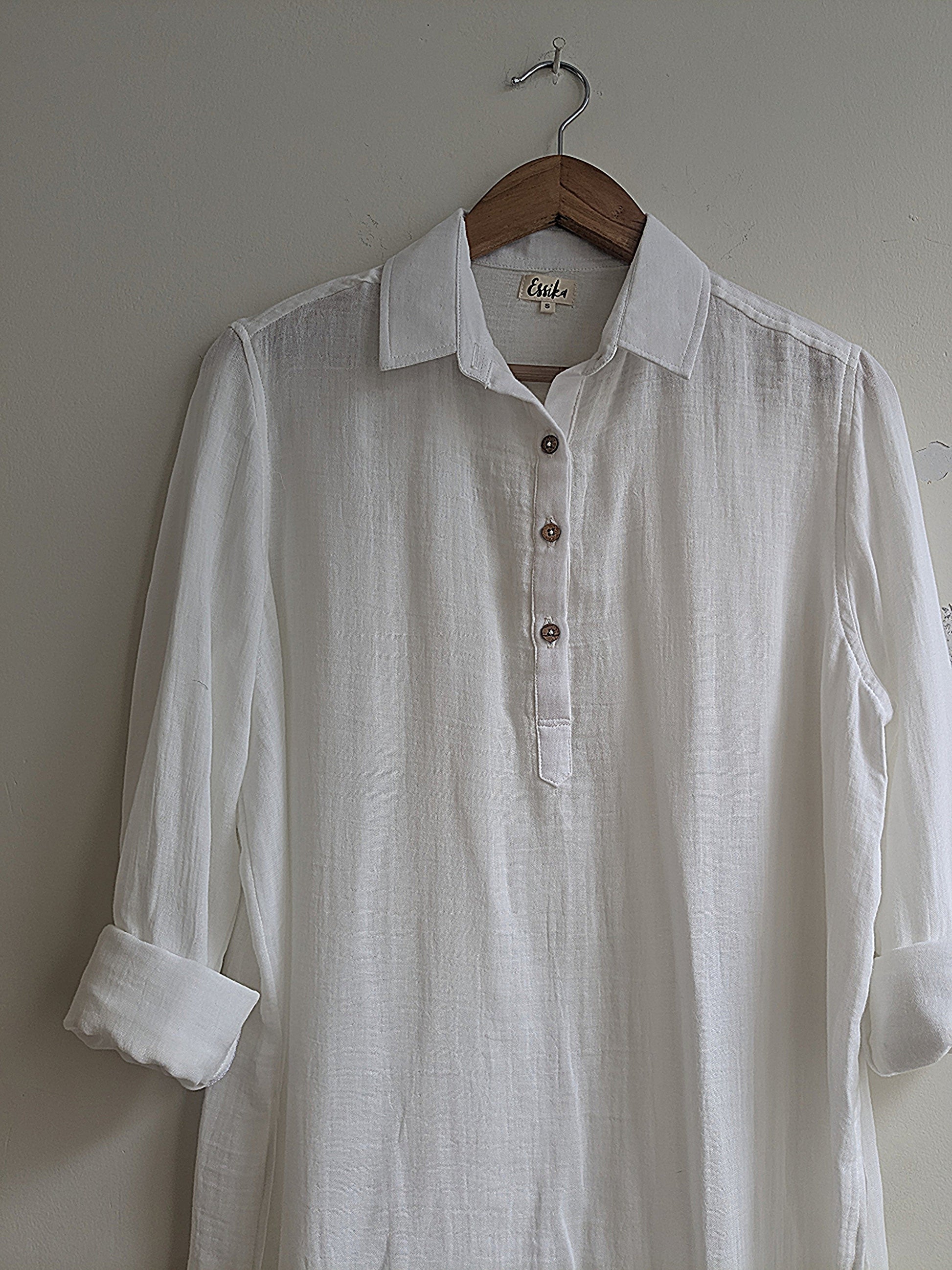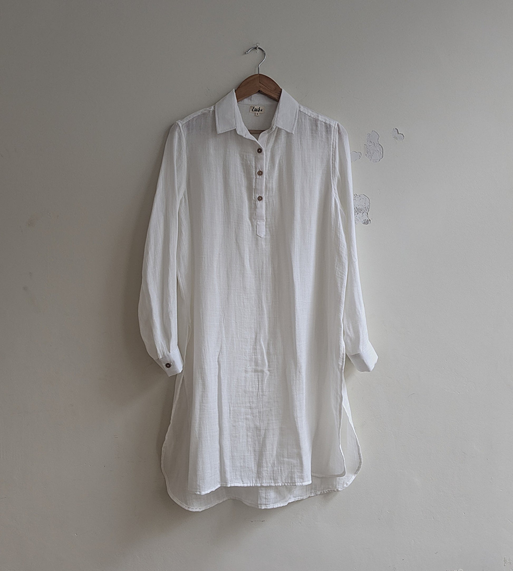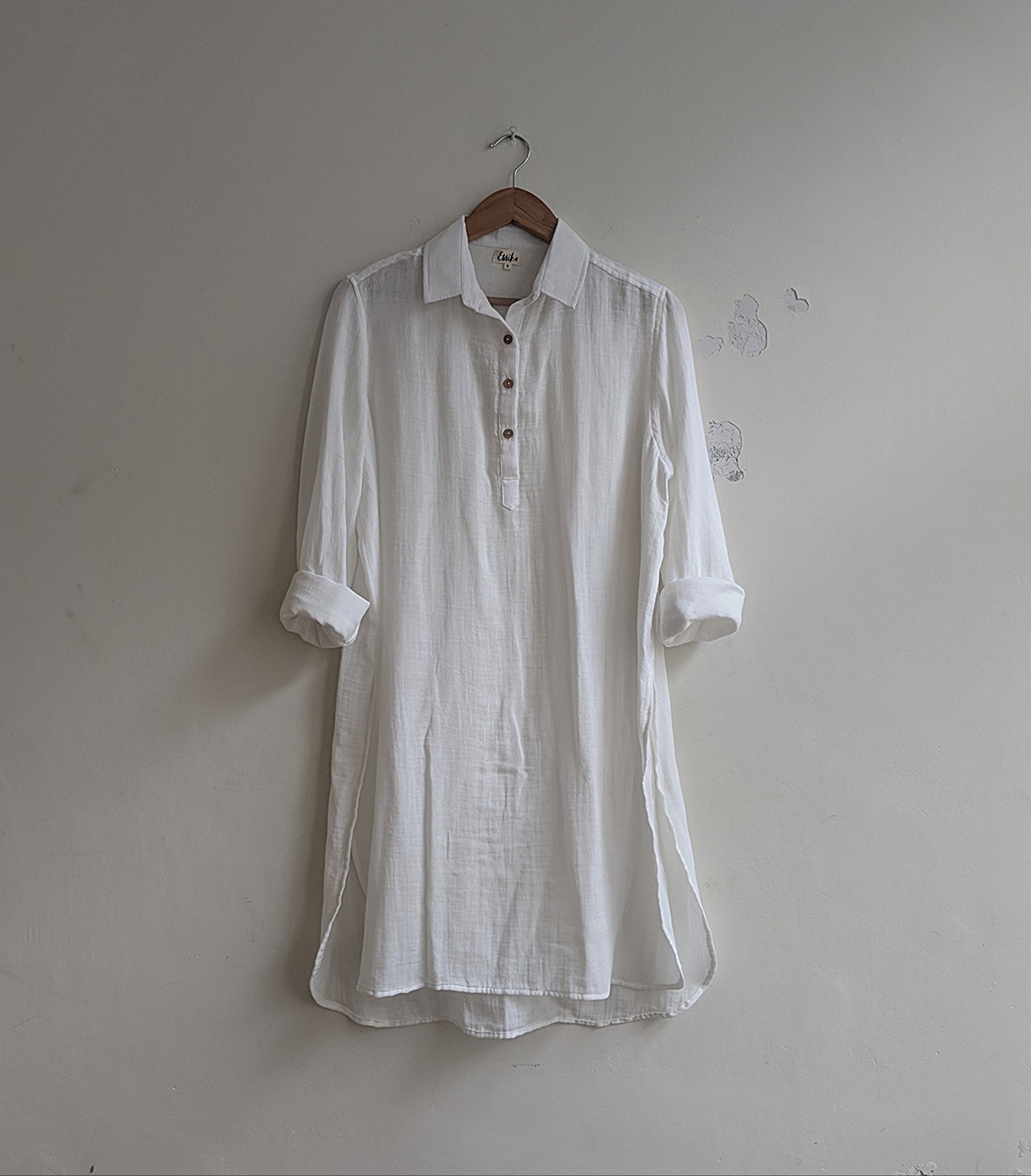 This is a longer version of our regular fit shirt. Features a placket in the front and gathers at the back for ease of movement. It is a roomy collar-neck kurta with full sleeves and cuffs, slightly boxy fit.