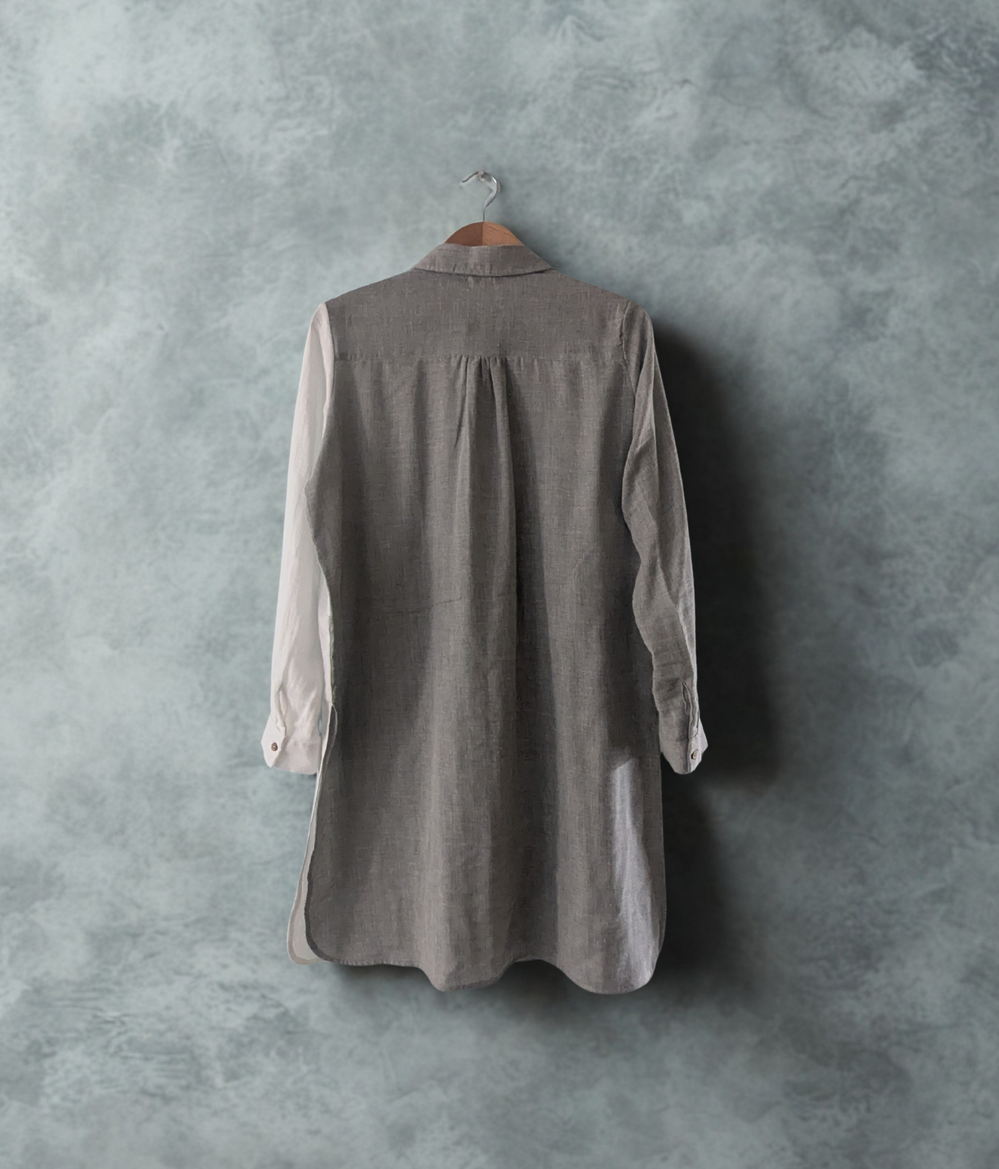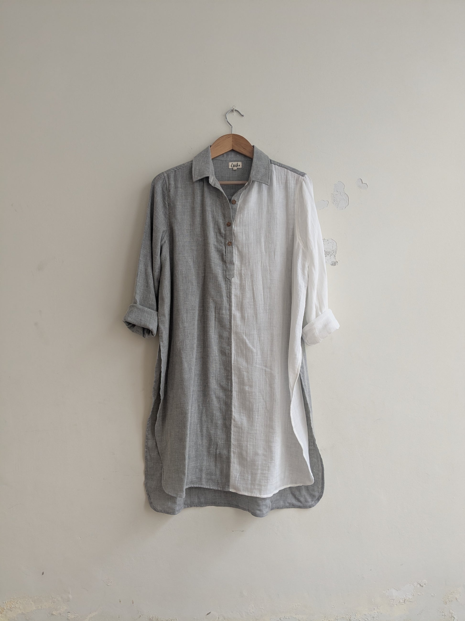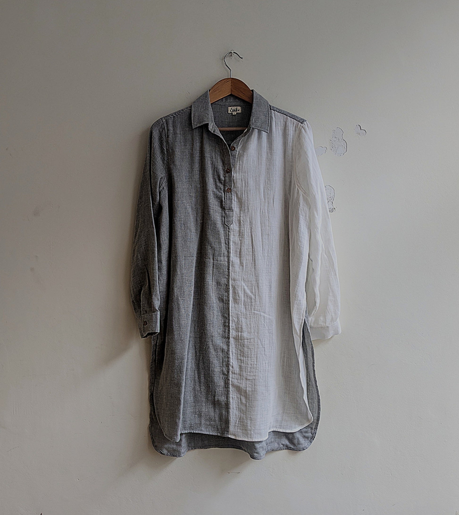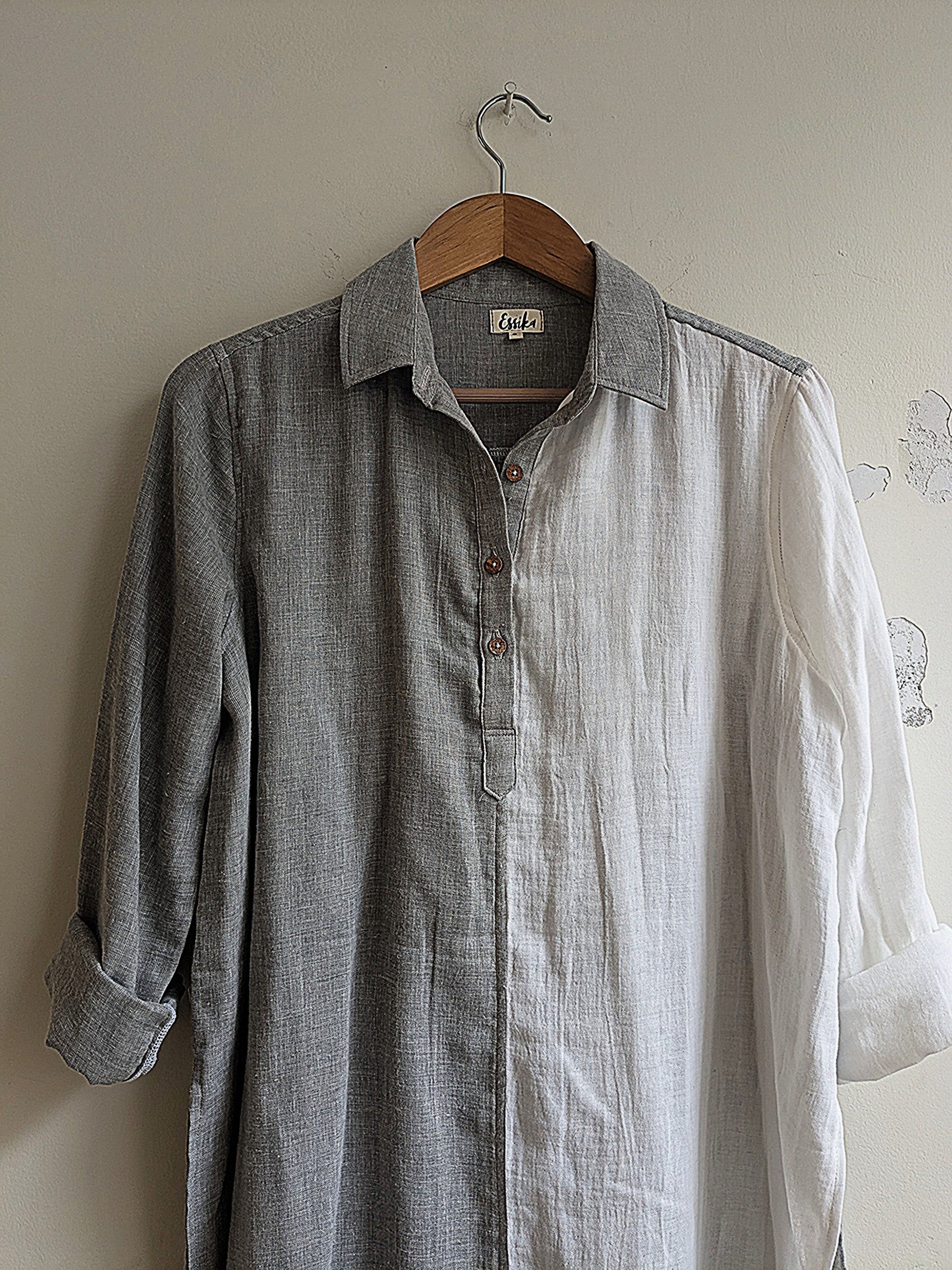 This is a longer version of our regular fit shirt. Features a placket in the front and gathers at the back for ease of movement. It is a roomy collar-neck kurta with full sleeves and cuffs, slightly boxy fit.