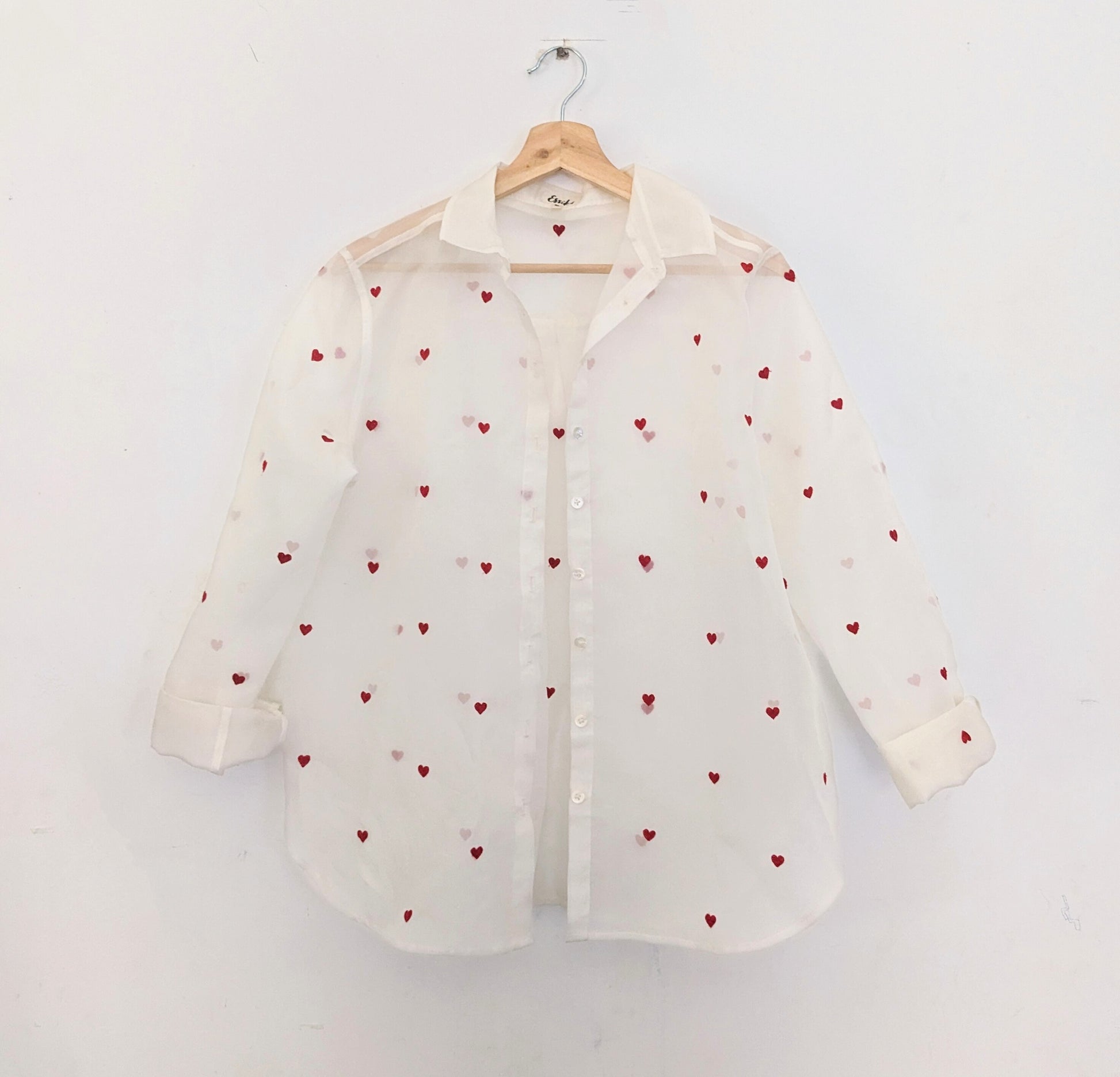 Our regular shirt in silk organza shirt embroidered with little hearts.