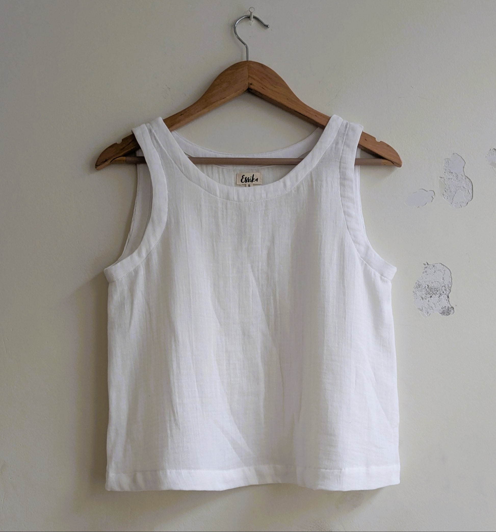 Sleeveless top for women in cotton gauze. Features an A-line seam with a round neck. Pull-over style with no button closures. Ends right at the hip line. Looks great paired with skirts, pants or shorts.Â